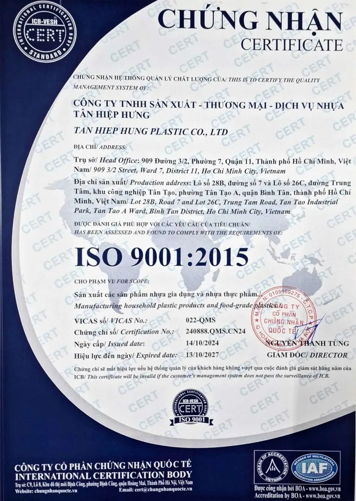 Đặc biệt, chúng tôi luôn đặt yếu tố an toàn vệ sinh thực phẩm lên hàng đầu bằng việc sử dụng chất liệu nhựa nguyên sinh trong sản xuất. Điều này không chỉ đảm bảo chất lượng và độ bền của sản phẩm mà còn góp phần bảo vệ sức khỏe người tiêu dùng.